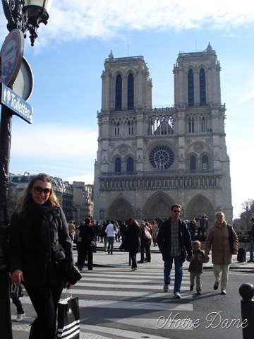 Já no dia seguinte, como íamos embora no fim da tarde para Barcelona, saímos do hostel já de mala e cuia. Fomos de novo até a Notre Dame (lembra que já tínhamos ido no primeiro dia, mas estava chovendo?) e dessa vez consegui uma foto bacana com ela de fundo (viva o namorado super fotógrafo!).
