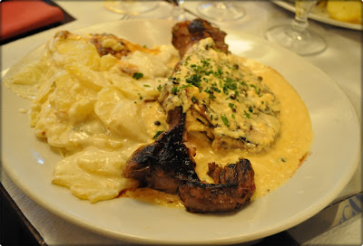 Já o namorado, assim como eu, não quis se aventurar muito e pediu o Entrecôte Laurencin sauce au poivre vert et gratin dauphinois, um filé ao molho de pimenta verde acompanhado do famoso gratin, que é feito de batatas e molho branco (uma delícia!).